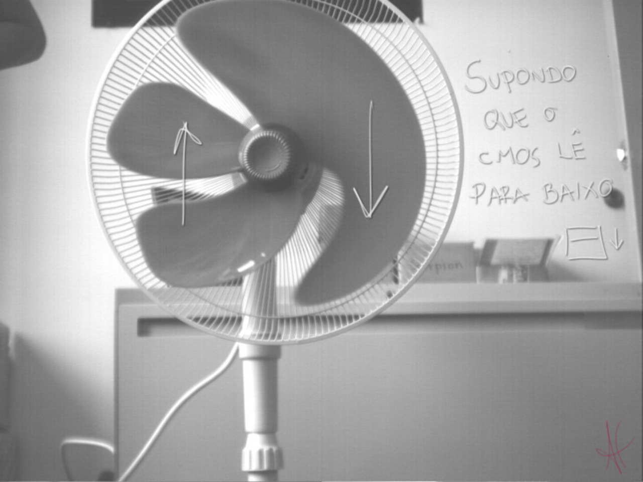 Também conhecido como “Line Scan”, o Rolling Shutter é um fenômeno que acontece nas câmeras que possuem sensores CMOS que deixam a imagem com um aspecto “molenga”, tipo essa ó (veja a imagem, mas continue lendo): _Repare que um lado contém uma pá gigante, o outro contém pás pequeninas, pois o ventilador gira as pás em um determinado sentido, onde se traçarmos um eixo y no meio dele, temos duas direções antagônicas, uma para cima e outra para baixo, ou seja: uma acompanhando o sentido da leitura do sensor e outra indo a contra ele, isso explica essa imagem. _ Isso ocorre porque a imagem é não é registrada no sensor de uma só vez, ela é “escaneada” de cima para baixo (isso acontece muito rápido, é coisa de nanosegundos), porém quando o assunto fotografado sofre mudanças muito rápidas (acontece mais com filmagens), o sensor lê a imagem de cima...