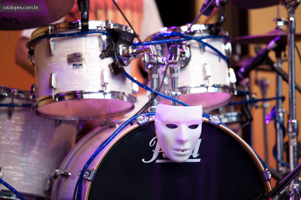 A bateria de Rafa Rocha e sua máscara Chegando no local mesmo antes, já havia clima de show; a caminho do palco já dava pra ouvir aquele som que parece que tem reverb. Com precisão de um relógio suíço a Banda Tono começa seu show no palco montado pela Oi FM no Arpoador, Rio de Janeiro. Um show tanto quanto especial, na beira da praia que tem o pôr do Sol mais bonito do RJ. Equipo com 70-200mm e vou em busca dos melhores ângulos, e não demoro muito para reparar que estava em uma situação absurdamente confortável em termos fotográficos: show com luz de final de tarde! É tudo que um fotógrafo quer pra vida: eu tinha ali o melhor dos dois (ou mais) mundos, a luz de um iluminador profissional, aliás confesso que adoro fotografar os shows promovidos pela Oi, pois a coisa é como tem que ser:...