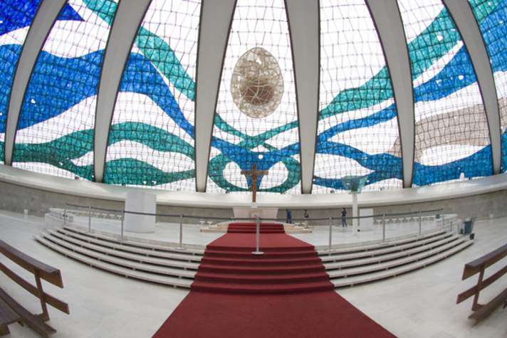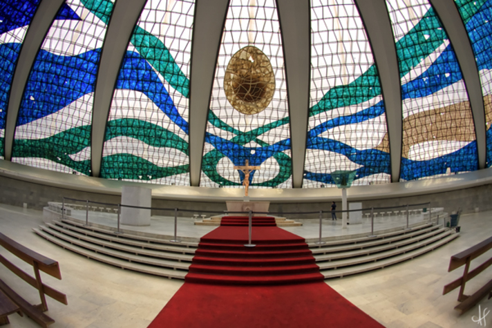 Mais uma! De um arquivo raw eu fiz 6 exposições e exportei pra tiff (clique aqui para saber como fazer isso no Lr), depois joguei pro Photomatix, fiz Tone Mapping duas vezes, uma para Details Enhancer (1) e outra para Tone Compressor (2), depois fiz mais uma versão em Tone Compressor (3) dando atenção especial para as ondas do teto. Em seguida joguei a (1) e (2) pro Photoshop, coloquei a (2) em Overlay (tudo agora tem opacity) em cima da (1), depois usei a Pen Tool e transformei o path em seleção pra ter as linhas do teto, fiz um layer mask em cima de uma das exposições mais claras pra ganhar textura nas ondas coloridas, dupliquei esse layer, apliquei a camada e usei o Topaz Adjust > Spicify (o grande truque), overlay nela e opacity pra algo bem baixo tipo 23% (como todas as outras opacities do arquivo, tudo baixinho), dupliquei o layer de fundo e botei Topaz Adjust > Spicify de novo, só que dessa vez pra pegar geral, e como de costume: overlay com opacity de 18%.