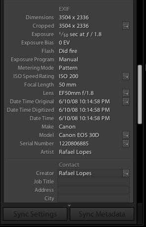 Além disso, outra funcionalidade muito boa é a preservação metadata da foto, isto é: quando você usa o Lightroom em uma foto, ela não perde o EXIF, muito pelo contrário, você pode adicionar informações no metadata, como por exemplo o lugar onde ela foi tirada, o nome do criador, etc. - já perceberam que todas as minhas fotos têm escrito no canto inferior esquerdo o meu nome e o meu site? É por isso. Pois sempre na hora de importá-las para a Library, eu mando adicionar esse texto no metadata da foto, no campo copyright. Ele automaticamente insere isso em todas as fotos, depois quando eu mando exportar (você vai entender o porque da exportacão, continue lendo), ele insere a marca d`água, tudo automático e muito fácil.