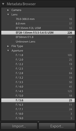 A Library do Lr é orientada à metadata, isto significa que você pode fazer buscas em suas fotos por eles usando a função metadata browser! Na verdade o “grande lance” do Lightroom é a Library. Veja como ele é para o nicho de fotógrafos: dá pra fazer um filtro (clicando e apertando ctrl para selecionar o próximo campo também) para me mostrar somente as fotos que foram batidas do dia 5 ao dia 7 desse mês, sem flash, com ISO100, lente 28-135 com f/5.6. Ele me mostra somente o que eu selecionei, bem fácil de achar (agora imagine isso para TODAS as suas fotos).