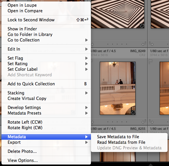 Um menu como o da imagem abaixo irá abrir, vá até “Metadata”, depois em “Save Metadata to File” (se a opção de Automatically write changes into XMP estiver marcada nas preferências do seu Lighroom, dispensa-se os itens 1 e 2;