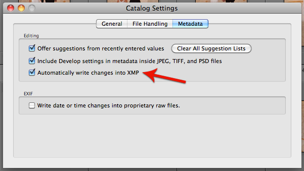 Na aba “General” haverá um botão “Go to Catalog Settings”, clique nele e a janelinha abaixo irá abrir, marque a opção indicada pela seta vermelha e pronto (“Automatically write changes into XMP”), tudo que você fizer no que diz respeito a tratamento das fotos, será gravado nos xmp sidecars.