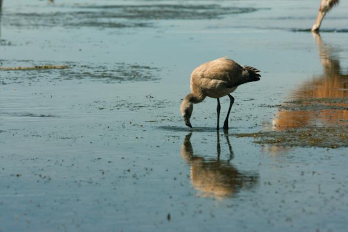 Perguntei eu pro guia que andava conosco: Por que existem tão poucos flamingos nesse lago gelado? É porque esse ainda é bebê e ainda não tem asas pra voar; e quando chega essa época do ano os flamingos migram voando para um lugar mais quente e confortável, ou seja: ele sobrou. Mas tinham umas lhamas pra fazer companhia pra ele (ou ela, sei lá).